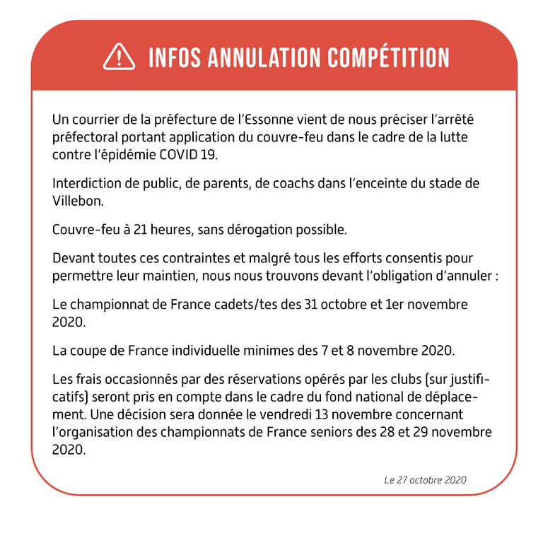 Avec le redémarrage de l'épidémie de Covid-19, la valse des annulations de compétitions de judo recommence : la Fédération Française de Judo a annoncé hier soir l'annulation du Championnat de France cadets qui devait se tenir le week-end du 31 octobre à Villebon-sur-Yvette (Essonne) ainsi que celle de la Coupe de France minimes du week-end suivant dans la même salle.