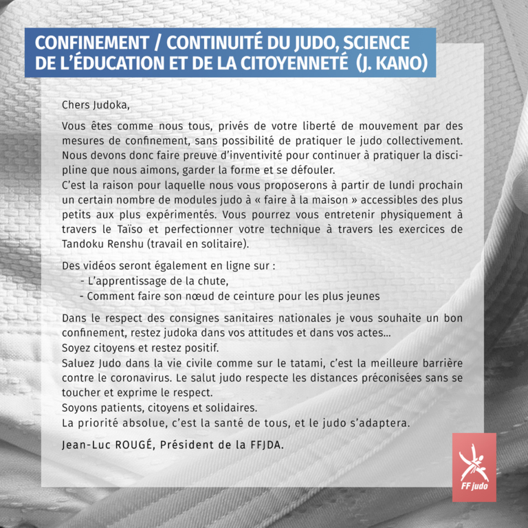 La Fédération Française de Judo indique que des modules "à faire à la maison" seront en ligne à partir de lundi 23 mars pour continuer le judo sous d'autres formes (voir le communiqué ci contre). Vous pouvez également travailler en Tandoku Renshu, c'est-à-dire tout seul. Et bien entendu, vous pouvez pratiquer des exercices de maintien en forme ou de renforcement musculaire.