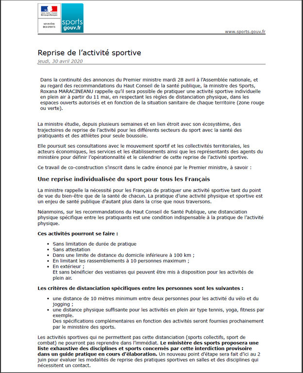 Mais rien ne nous empêcherait, à partir du 11 mai, d'organiser des séances de footing en extérieur, avec un maximum de 10 participants et une distance de 10 mètres entre chaque participant. C'est le sens de l'interview de la Ministre des Sports à l'Equipe le 2 mai : "La pratique en club pourra se faire, avec des groupes de moins de dix personnes, en extérieur, sauf pour les sports collectifs et de contact. Mais toutes les associations, y compris celles de sports collectifs et de judo, pourront proposer des activités, en respectant la distanciation."
