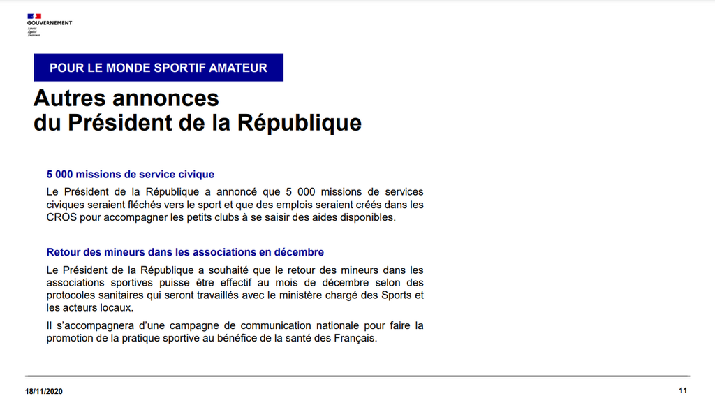 Cela semble se confirmer : après une réunion mardi 17 novembre entre le Président de la République et les acteurs du monde sportif, professionnels et amateurs, on semble s'orienter vers une reprise des activités des clubs pour les mineurs au mois de décembre.